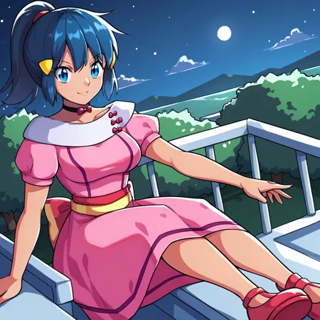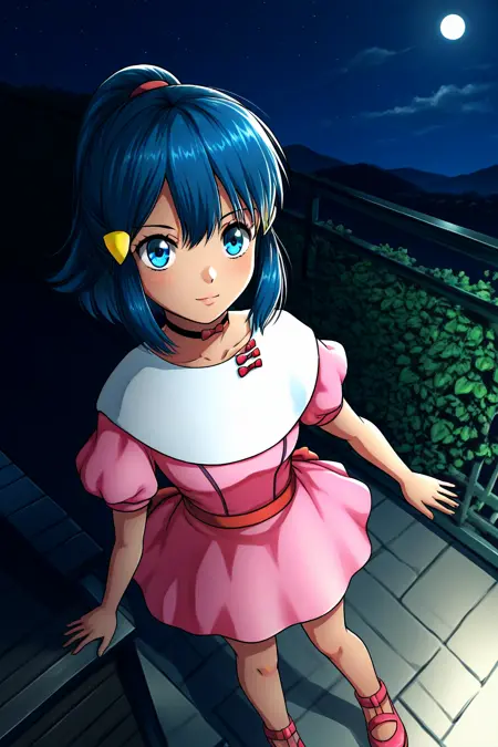 wdawn, [dawn \(pokemon\)], blue eyes, dark blue hair, short hair, sidelocks, ponytail, hair clip, pink dress, short sleeves, choker, red sash, yellow sash, knees, shoes, pink footwear