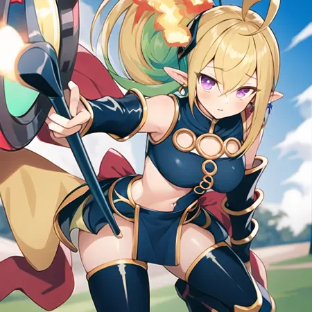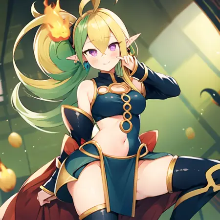머리카락/특징: 긴 머리, 금발, 녹색 머리, 녹색 눈, 뾰족한 귀, 옆머리 패턴, 아호게, 눈 사이의 머리카락, 듀얼 몬스터