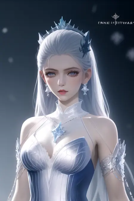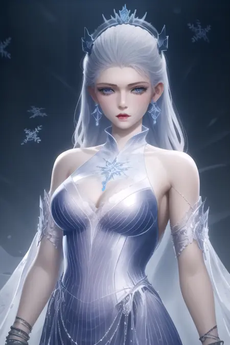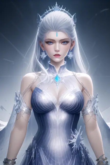 Sn0wEmper0rDD2, 1girl, solo, long hair, blue eyes, hair ornament, blue dress, silver dress, bare shoulders, jewelry, medium breasts, white hair, grey hair, earrings, bracelet, lips, grey eyes, tiara, gem, ice, snowflakes,