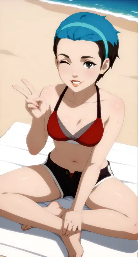 头发盘起,发带,蓝色发带,运动背心,黑色运动背心,露腰,裤子,红色裤子