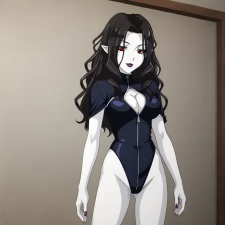 • Trigger : Carmilla, 1girl, breasts, cape, cleavage cutout, pointy ears, long hair, black hair, lipstick, red eyes, makeup, vampire, pale skin, bodysuit, colored skin, purple lips, cowboy shot