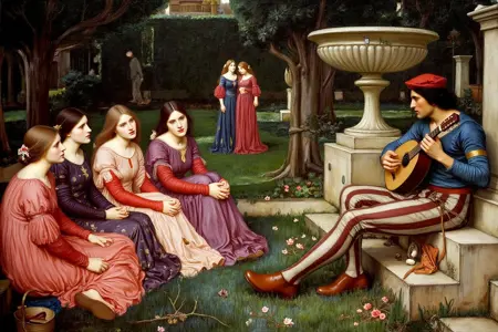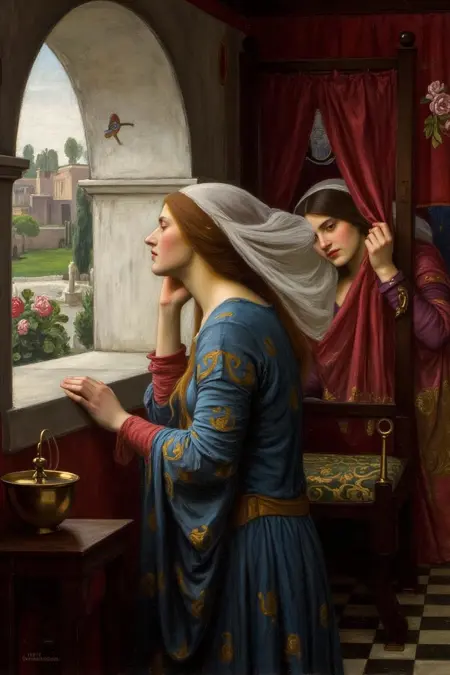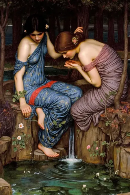 • Pre-Raphaelite Influence: Though painting later than the original Pre-Raphaelite Brotherhood (which emerged in the mid-19th century), Waterhouse adopted their love for rich colors, intricate details, and romanticized storytelling.