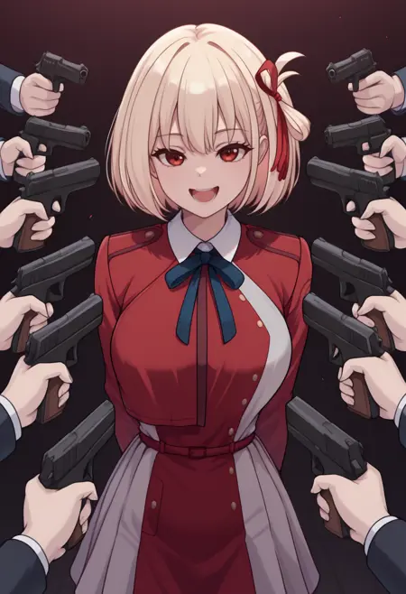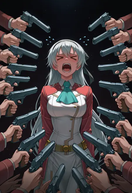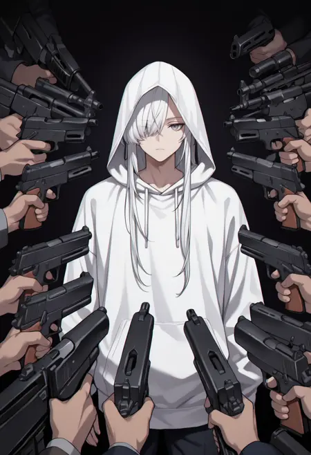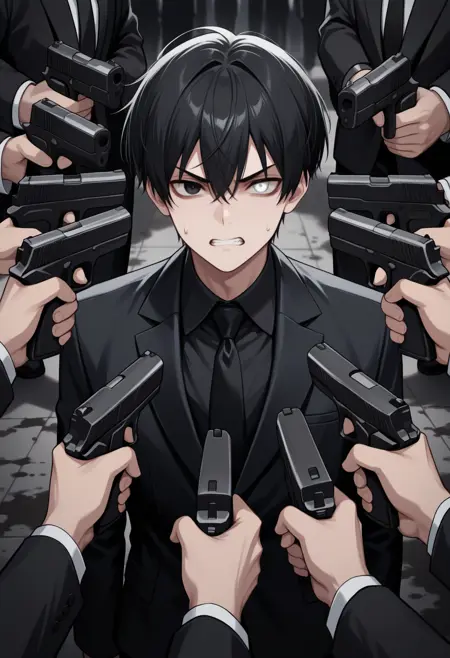 标签: 6+others, at gunpoint, solo focus, holding gun, handgun, too many