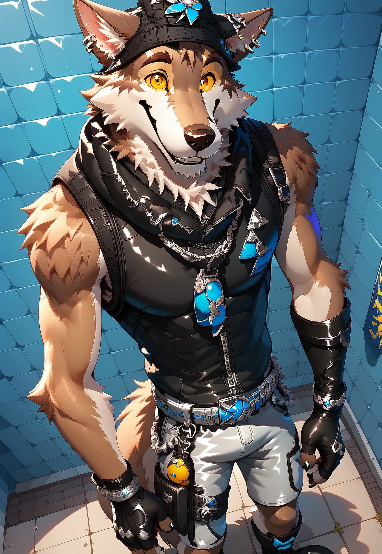 몸: 노란 공막, 노란 눈, 갈색 털, 늑대, 귀 piercing, piercing, 검은 손톱, 귀걸이, 이톤 털