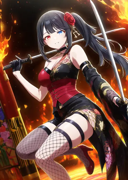 ・blue eyes, red eyes, heterochromia,choker, bangs, long hair, black hair,side ponytail, hair ornament,hair flower, gloves,black gloves,fishnets, thighhighs,asymmetrical legwear,garter strapsbare shoulders,Red corset, asymmetrical kimono,large breasts, cleavage,Red High Heels,