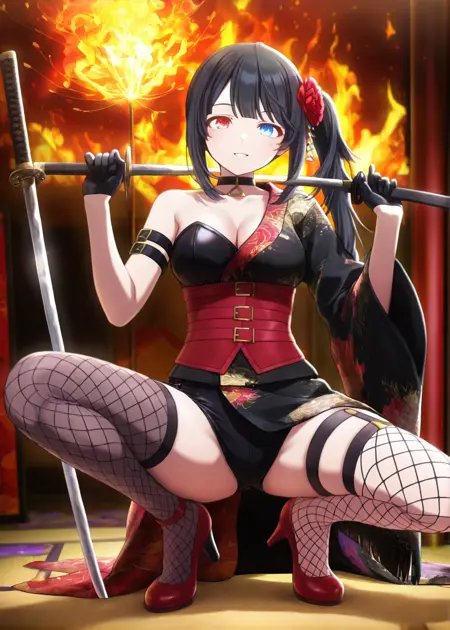・青い目、赤い目、虹彩異色症、チョーカー、前髪、長い髪、黒髪、片側ポニーテール、髪飾り、花の髪飾り、手袋、黒い手袋、フィッシュネッツ、太ももハイ、片側だけの脚部装着、ガーターストラップ、裸の肩、赤いコルセット、非対称な着物、大きな胸、胸元、赤いハイヒール、