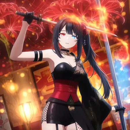 ・blue eyes, red eyes, heterochromia,choker, bangs, long hair, black hair,side ponytail, hair ornament,hair flower, gloves,black gloves,fishnets, thighhighs,asymmetrical legwear,garter strapsbare shoulders,Red corset, asymmetrical kimono,large breasts, cleavage,Red High Heels,