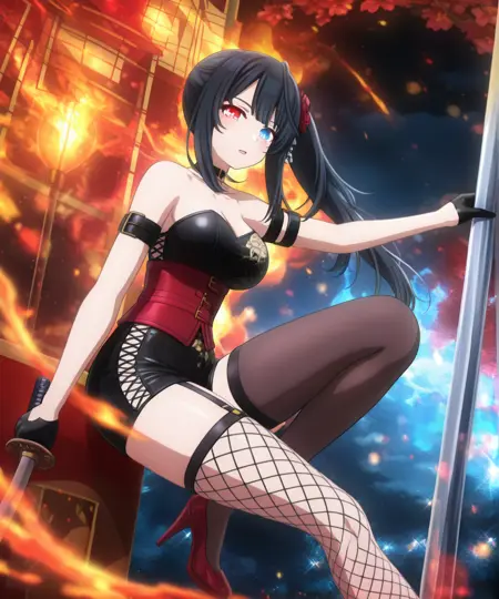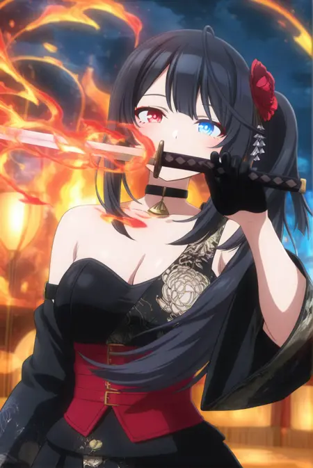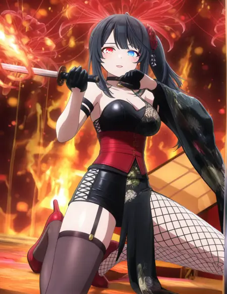 ・青い目、赤い目、虹彩異色症、チョーカー、前髪、長い髪、黒髪、片側ポニーテール、髪飾り、花の髪飾り、手袋、黒い手袋、フィッシュネッツ、太ももハイ、片側だけの脚部装着、ガーターストラップ、裸の肩、赤いコルセット、非対称な着物、大きな胸、胸元、赤いハイヒール、