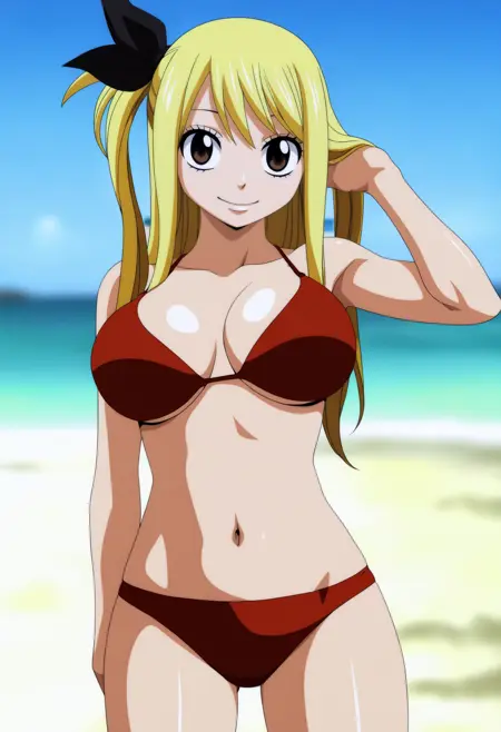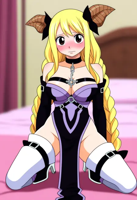 基本プロンプト:1girl, lucy heartfilia, blonde hair, twin braids, long hair, hair bow