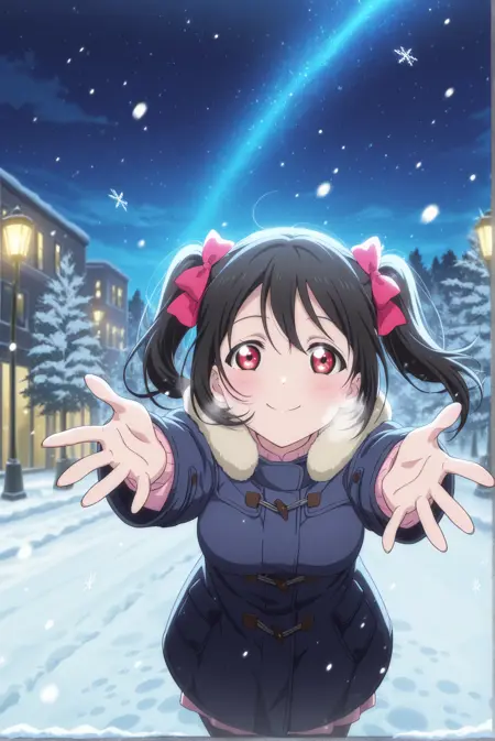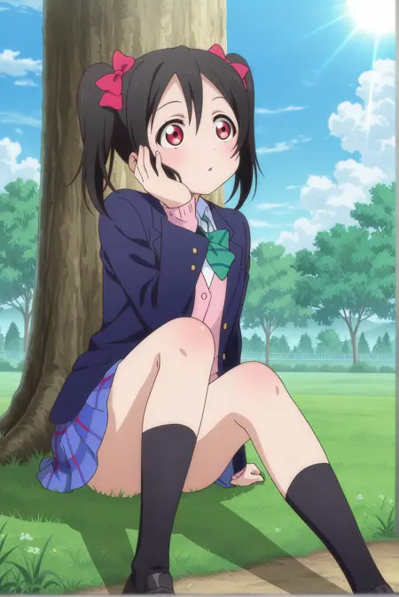 校服款:nico-ya、nico-校服、1girl、黑发、红眼、双马尾、蝴蝶结、发带、校服、音乃木坂学院校服、西装外套、夹克、裙子、冬季校服、袜子、针织开衫