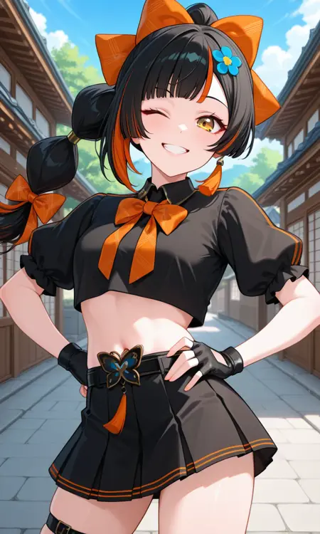 choya hanabi, braided ponytail, hair flower, hair bow, orange bow, bowtie, black shirt, midriff, puffy short sleeves, fingerless gloves, black skirt, pleated skirt, thigh strap- 可添加
