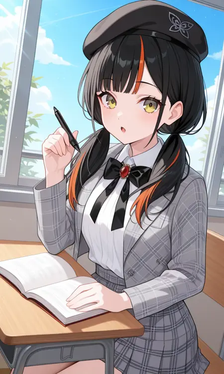 hanabi second, long hair, low twintails, black beret, grey jacket, plaid jacket, white shirt, collared shirt, black bowtie, grey skirt, plaid skirt📖第二套装扮(不带外套):