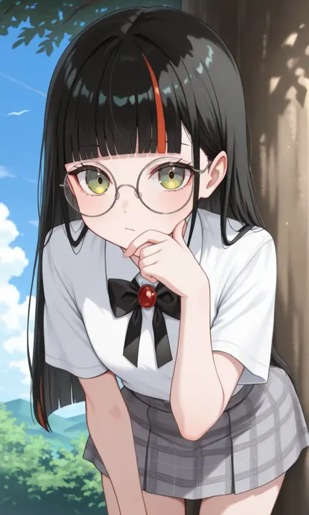 hanabi second, long hair, low twintails, black beret, white shirt, collared shirt, black bowtie, puffy short sleeves, grey skirt, plaid skirt可通过以下提示词更改她的发型: