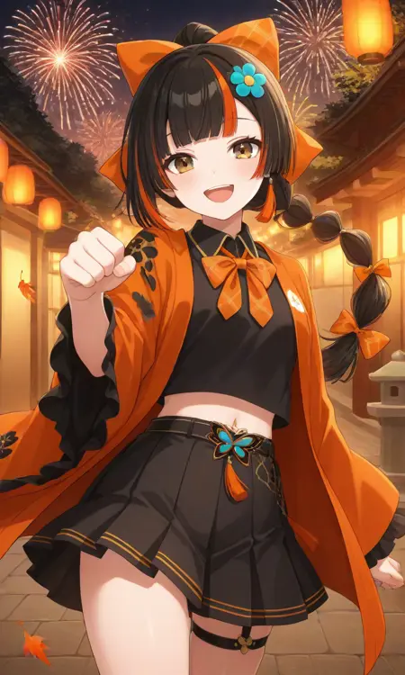 choya hanabi, braided ponytail, hair flower, hair bow, orange bow, bowtie, black shirt, midriff, puffy short sleeves, fingerless gloves, black skirt, pleated skirt, thigh strap- You can add