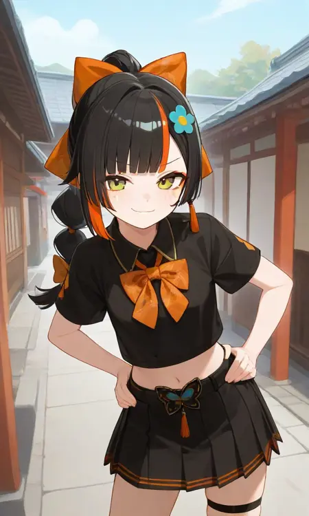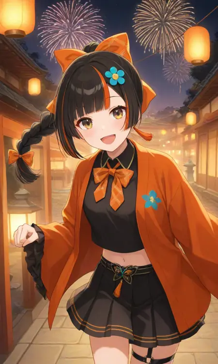 choya hanabi, braided ponytail, hair flower, hair bow, orange bow, bowtie, black shirt, midriff, puffy short sleeves, fingerless gloves, black skirt, pleated skirt, thigh strap- 髪の再現性を高めるには、