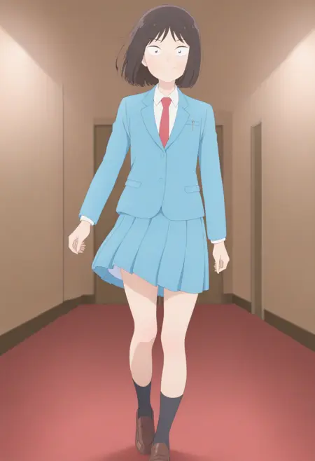 skirt, shirt, long sleeves, school uniform, jacket, white shirt, pleated skirt, necktie, shoes, socks, blue skirt, brown footwear, blazer, blue jacket, red necktie, black socks, loafers, medium skirt