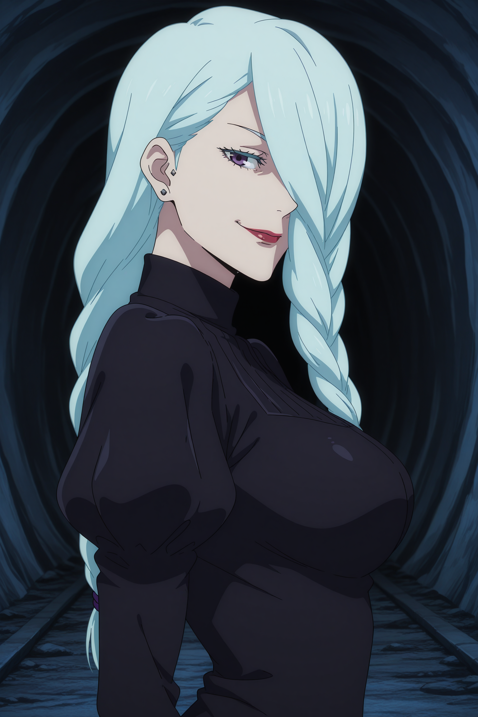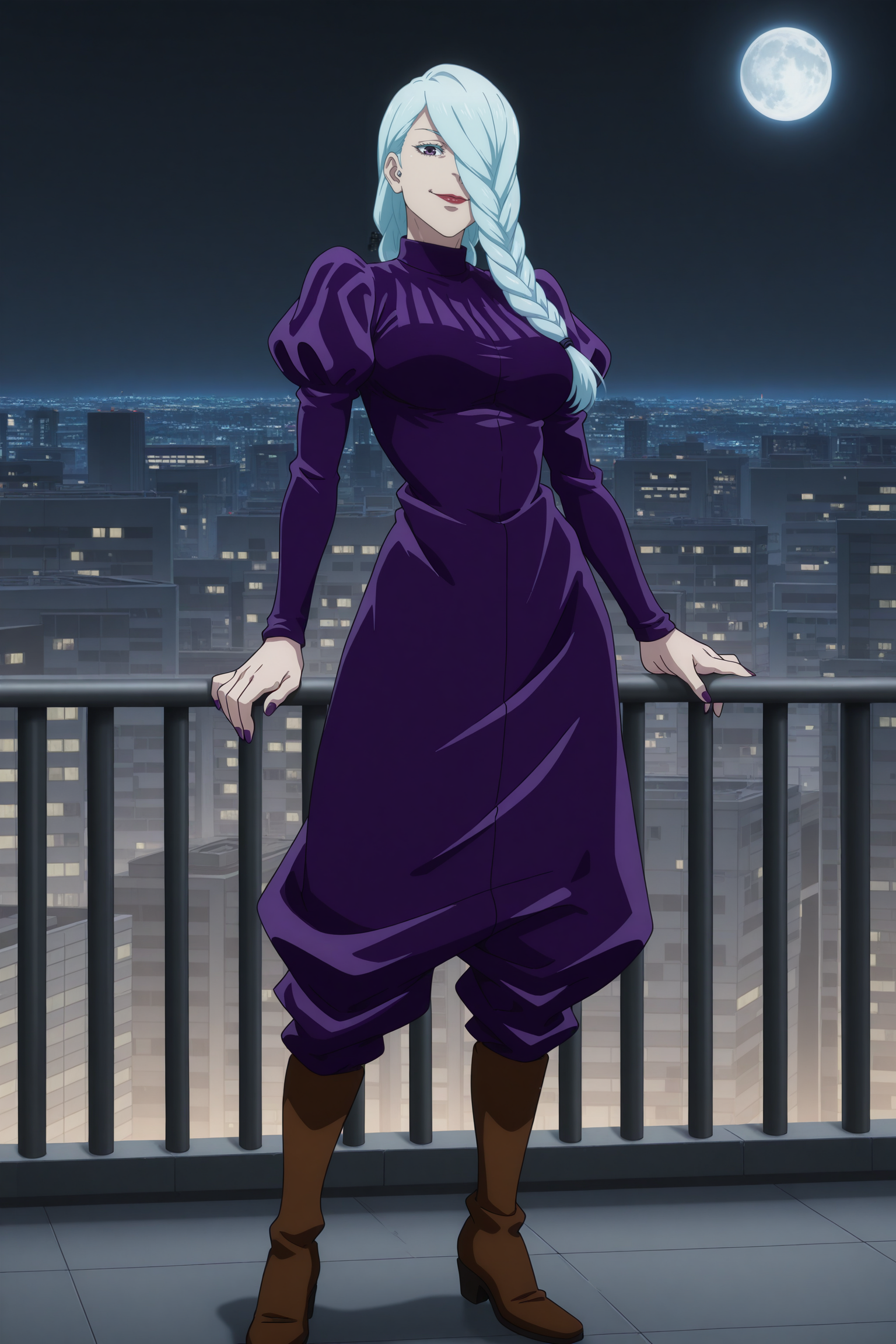 mei mei, long hair, light blue hair, braided ponytail, braided bangs, hair tie, hair over one eye, one eye covered, colored eyelashes, purple eyes, red lips, ear piercing, purple nails, long sleeves, juliet sleeves, black jumpsuit, brown footwear, knee boots