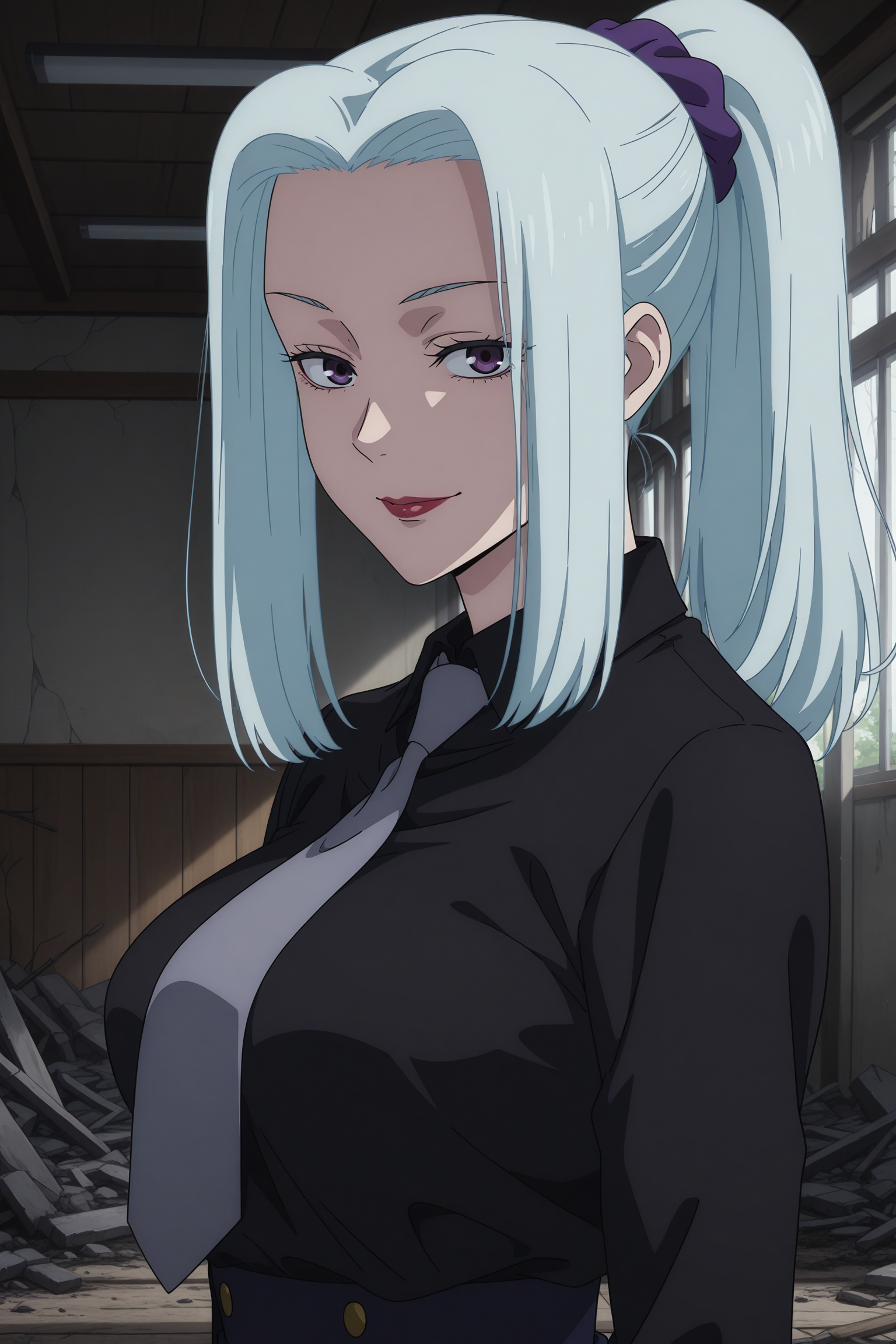 mei mei (past), medium hair, light blue hair, ponytail, parted bangs, sidelocks, hair scrunchie, purple eyes, red lips, purple nails, long sleeves, black shirt, collared shirt, grey necktie, blue pants, high-waist pants, baggy pants, black footwear, boots