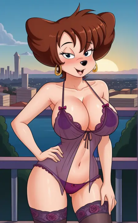 PONYXL_STYLE_VerComicsPorno_FamilyGuySimpson_ownwaifu, 1girl, large breasts, jewelry, makeup, brown hair, short hair, furry female, animal ears, snout, {nude, nipples, navel | swimsuit | lingerie | shirt | dress},