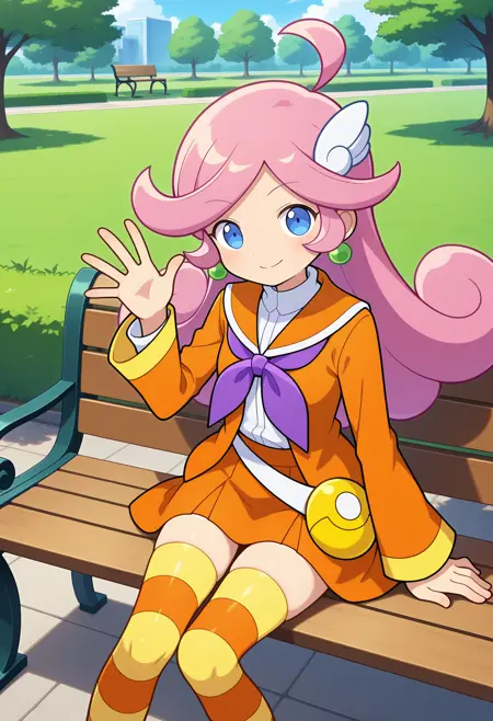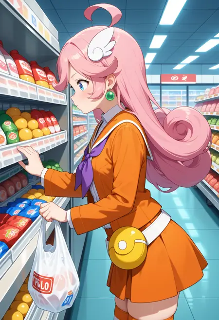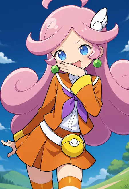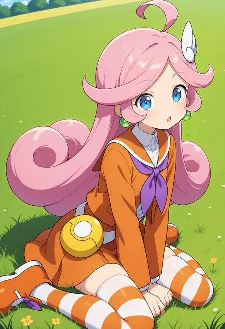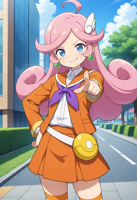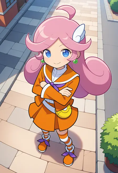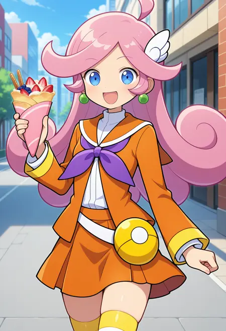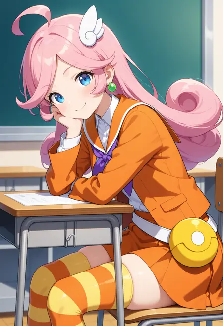 아우트핏1 (스타일2)aaraffi, 긴 머리, 분홍색 머리, 곱슬머리, ahoge, 머리 장식, 귀걸이, 파란 눈, 주황색 선원 칼라, 보라색 넥커치프, 흰 셔츠, 주황색 자켓, 긴 소매, 허리 가방, 주황색 치마, 줄무늬 허벅지 양말, 공식 스타일