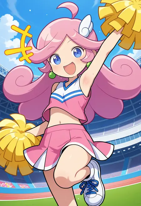服装1(风格3)aaraffi, long hair, pink hair, curly hair, ahoge, hair ornament, earrings, blue eyes, orange sailor collar, purple neckerchief, white shirt, orange jacket, long sleeves, fanny pack, orange skirt, striped thighhighs, official style, puyopuyo