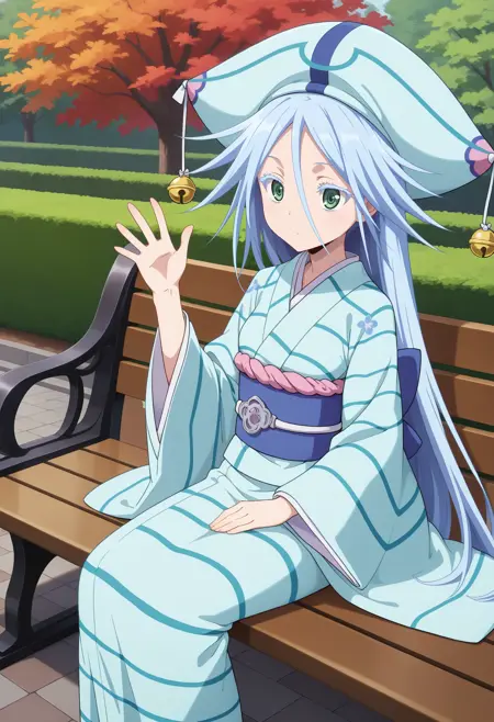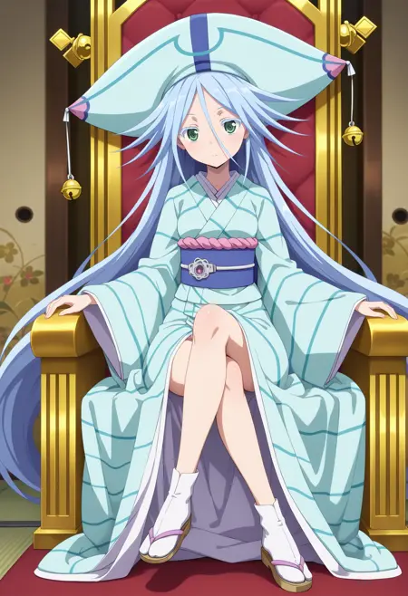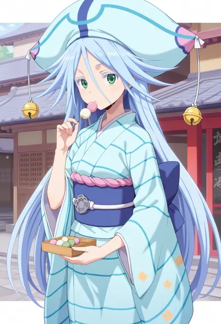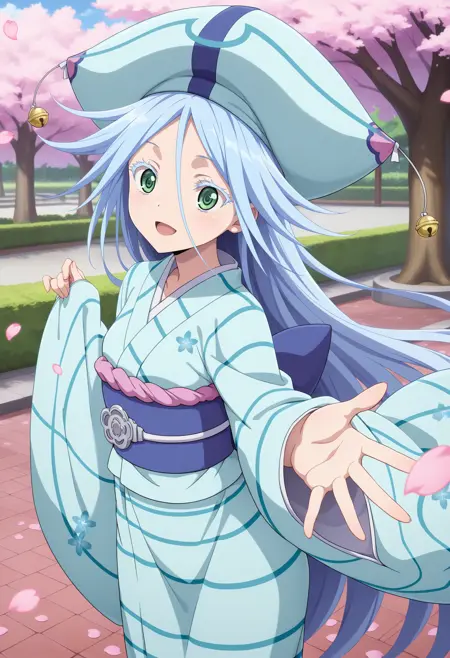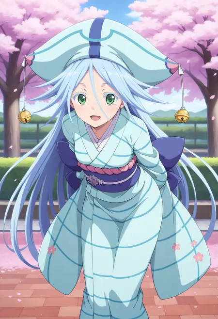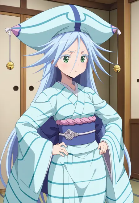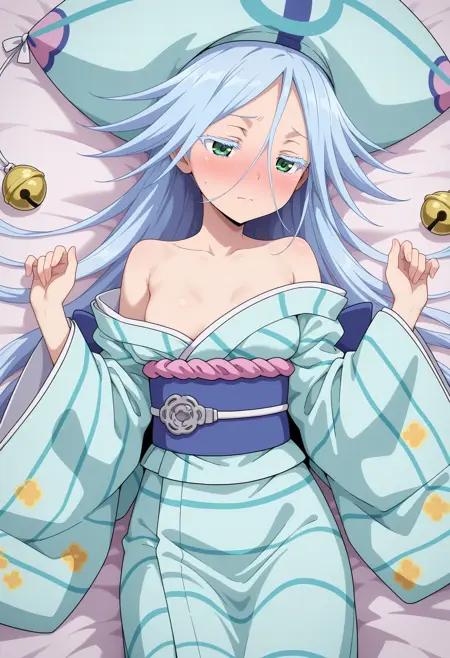 outfit1aaageha, long hair, blue hair, hat, blue headwear, jingle bell, green eyes, small breasts, blue kimono, long sleeves, wide sleeves, obi, sash