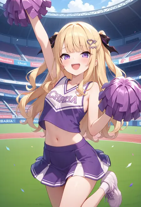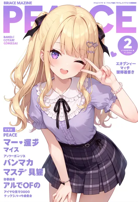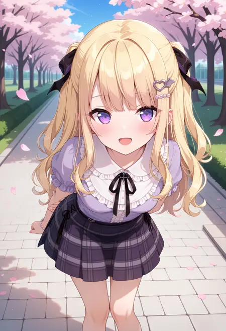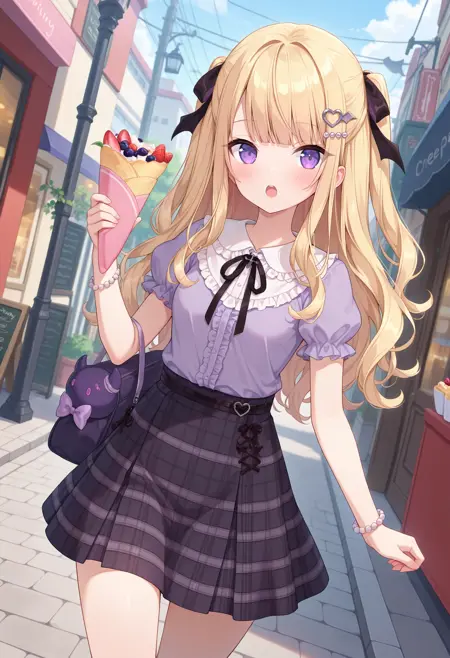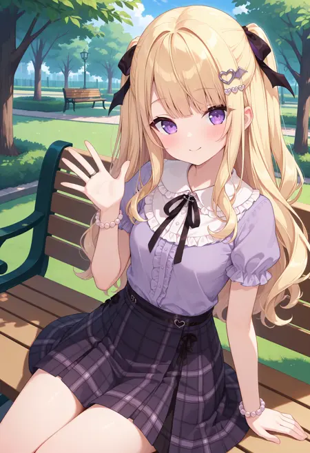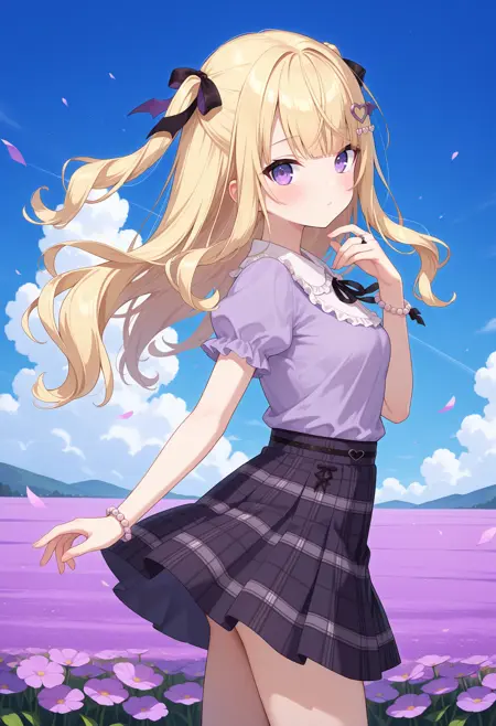 outfit2bbaria, long hair, blonde hair, two side up, hair ribbon, hair ornament, purple eyes, small breasts, frilled shirt collar, purple shirt, puffy short sleeves, bracelet, plaid skirt, black skirt