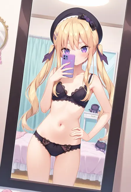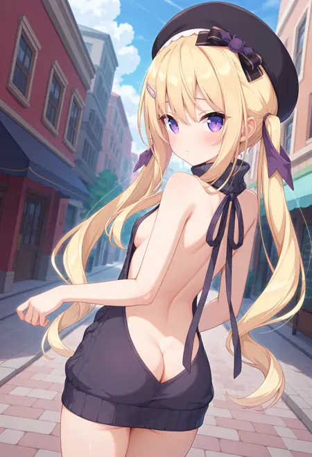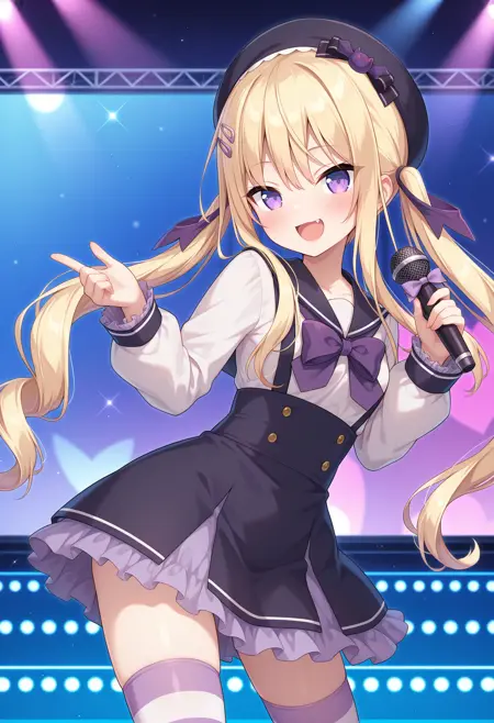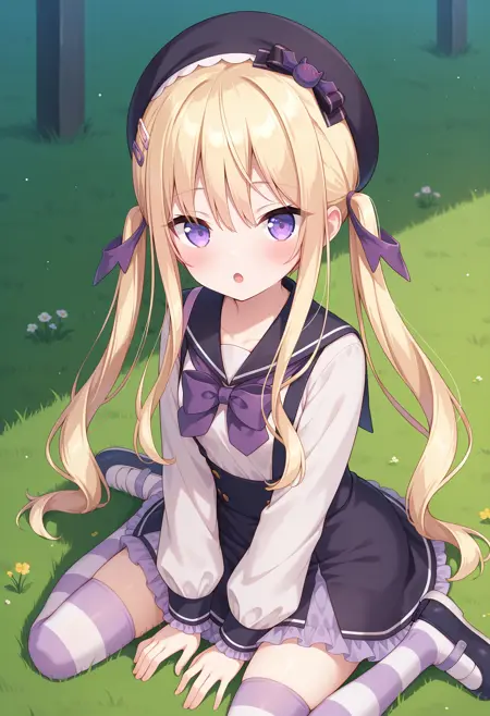outfit1aaaria, long hair, blonde hair, twintails, hair ribbon, beret, black headwear, hat bow, hairclip, purple eyes, small breasts, black sailor collar, purple bowtie, white shirt, long sleeves, suspender skirt, black skirt, frilled skirt, striped thighhighs