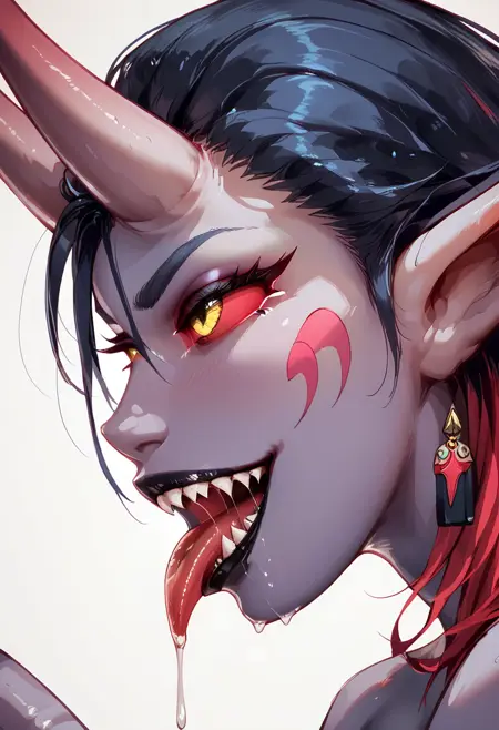 herzha_133, 1girl, colored skin, pointy ears, demon horns, multicolored hair, colored sclera, yellow eyes, demon girl, tail,