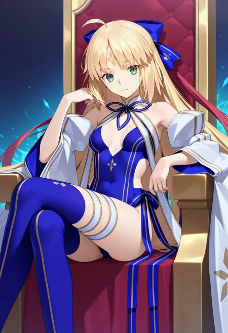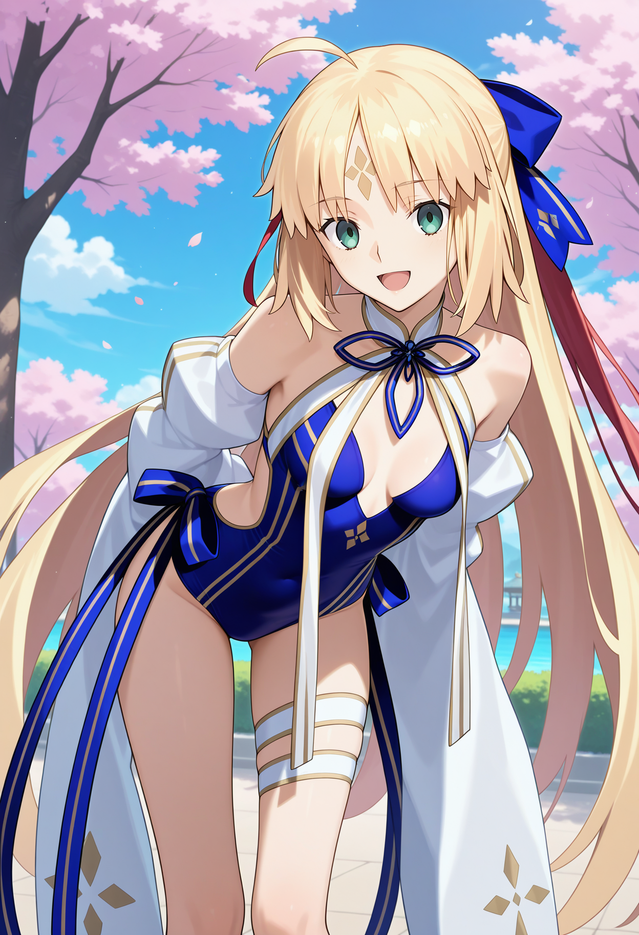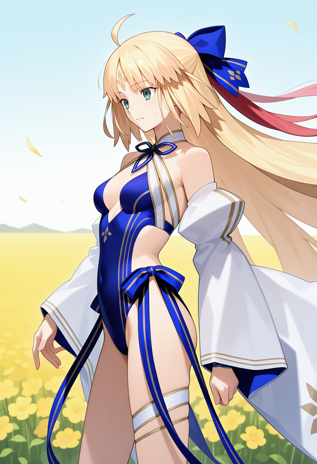 outfit3aacaster, long hair, blonde hair, ahoge, hair bow, blue bow, forehead mark, green eyes, small breasts, bare shoulders, neck ribbon, blue one-piece swimsuit, detached sleeves, wide sleeves, blue ribbon, thigh strap