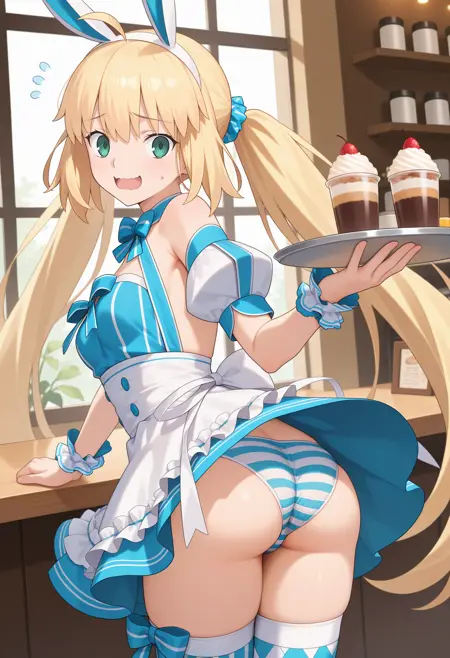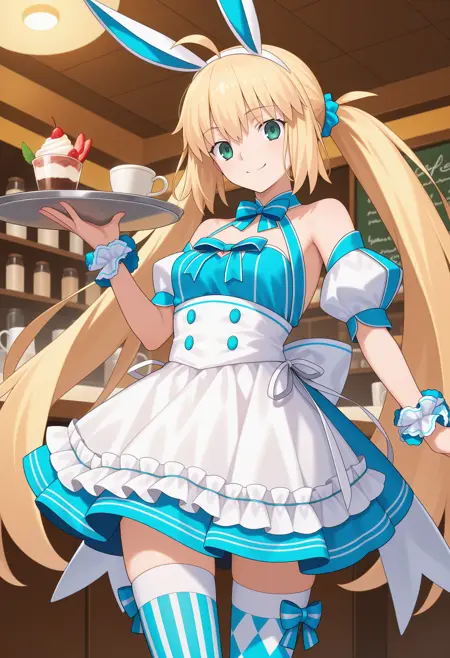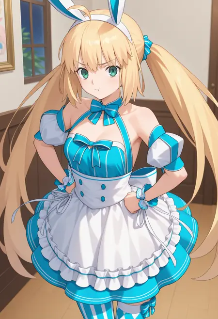 outfit2bbcaster, long hair, blonde hair, twintails, ahoge, animal ears, hairband, green eyes, small breasts, blue bowtie, blue dress, blue bow, detached sleeves, short sleeves, wrist cuffs, waist apron, white apron, mismatched legwear, vertical-striped thighhighs, argyle thighhighs