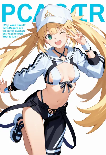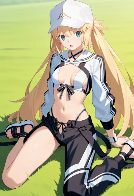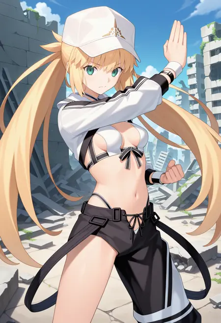 outfit1aacaster, long hair, blonde hair, twintails, hat, white headwear, green eyes, small breasts, criss-cross halter, white bikini, shrug (clothing), white jacket, long sleeves, wristband, single pantsleg, black pants