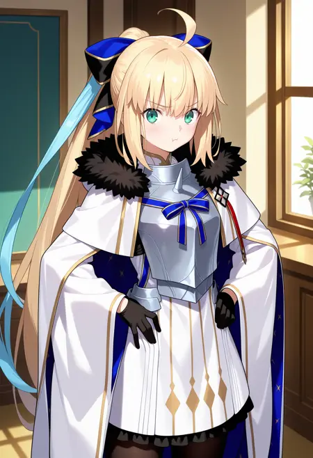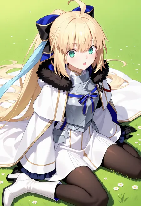 bbaesc, long hair, blonde hair, ahoge, ponytail, hair bow, black bow, green eyes, fur trim, white cape, blue ribbon, breastplate, armored dress, white dress, long sleeves, wide sleeves, black gloves, black pantyhose