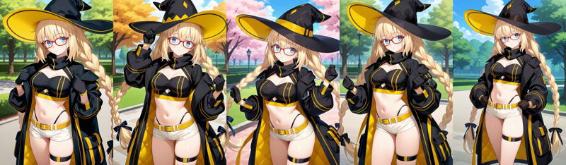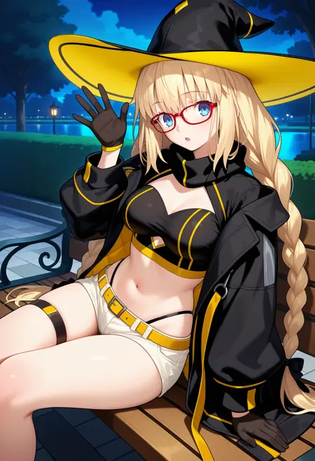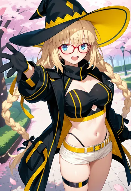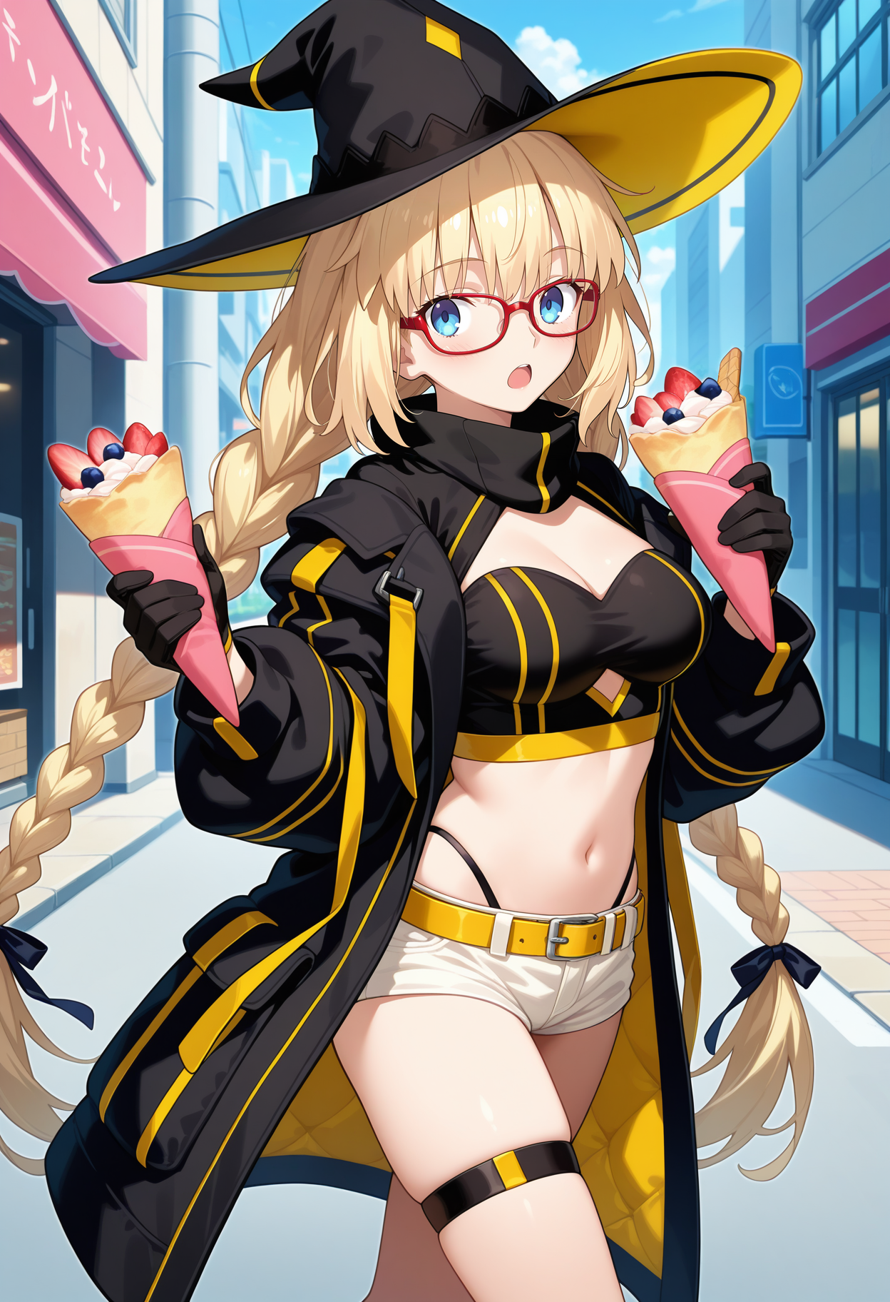 outfit4aaaesc, long hair, blonde hair, twintails, twin braids, witch hat, black headwear, glasses, red-framed eyewear, blue eyes, medium breasts, crop top, black coat, open coat, long sleeves, black gloves, midriff, yellow belt, highleg panties, short shorts, white shorts, thigh strap