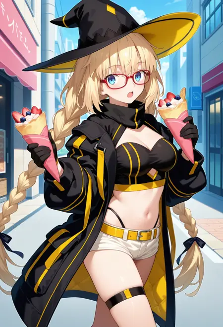 aaaesc, long hair, blonde hair, twintails, twin braids, witch hat, black headwear, glasses, red-framed eyewear, blue eyes, medium breasts, crop top, black coat, open coat, long sleeves, black gloves, midriff, yellow belt, highleg panties, short shorts, white shorts, thigh strap