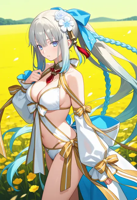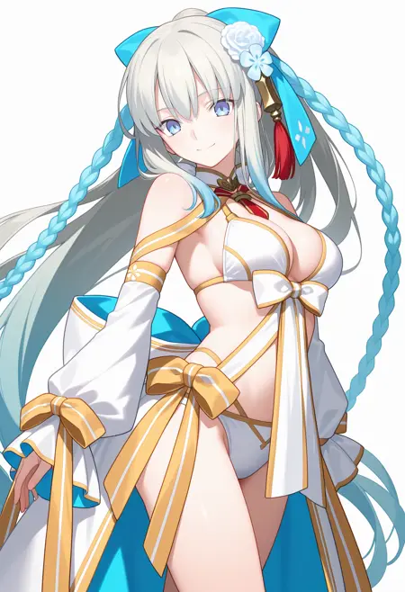 outfit3aamorgan, long hair, multicolored hair, grey hair, blue hair, ponytail, braid, hair bow, blue bow, hair ornament, hair flower, blue eyes, breasts, cleavage, white bikini, white bow, detached sleeves, yellow ribbon, back bow