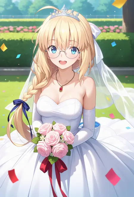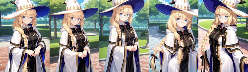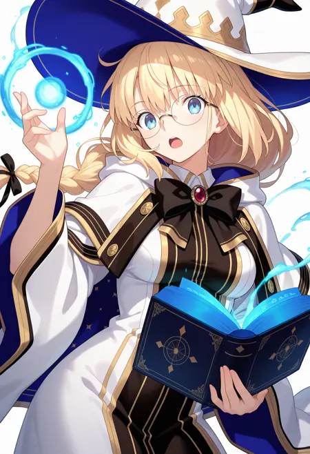 outfit1aaaesc, long hair, blonde hair, single braid, braided ponytail, hair ribbon, witch hat, white headwear, glasses, round eyewear, blue eyes, medium breasts, black bowtie, brooch, white robe, black dress, long sleeves, wide sleeves