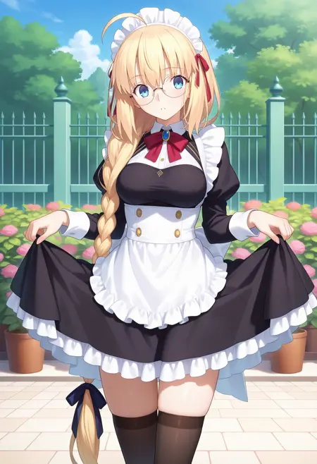 outfit2bbaesc, long hair, blonde hair, ahoge, ponytail, hair bow, black bow, green eyes, fur trim, white cape, blue ribbon, breastplate, armored dress, white dress, long sleeves, wide sleeves, black gloves, black pantyhose