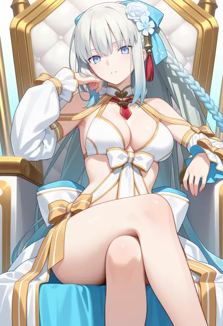 aamorgan, long hair, multicolored hair, grey hair, blue hair, ponytail, braid, hair bow, blue bow, hair ornament, hair flower, blue eyes, breasts, cleavage, white bikini, white bow, detached sleeves, yellow ribbon, back bow