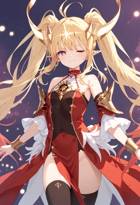 1girl, solo, blonde hair, long hair, twintails, thighhighs, pointy ears, horns, yellow footwear