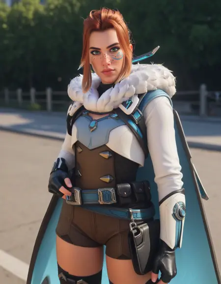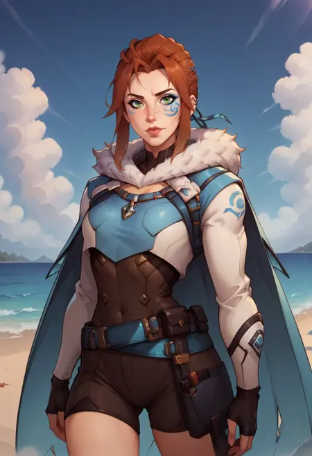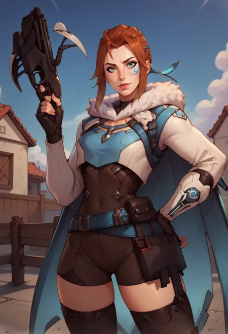 vest, shorts, thighhighs, boots, belt, fingerless gloves, fur trim,