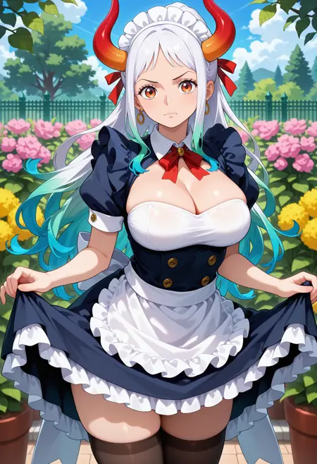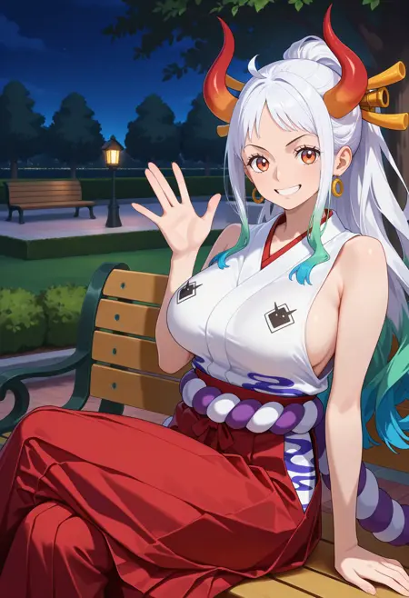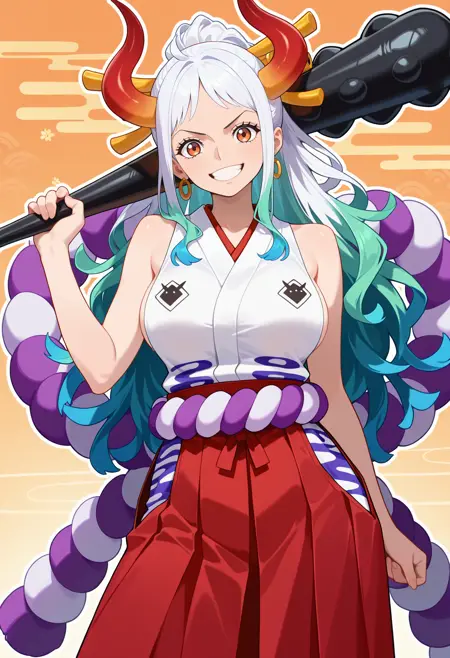 outfit1aayamato, long hair, multicolored hair, white hair, horns, hair ornament, earrings, orange eyes, large breasts, japanese clothes, white kimono, sleeveless, shimenawa, hakama skirt, red hakama