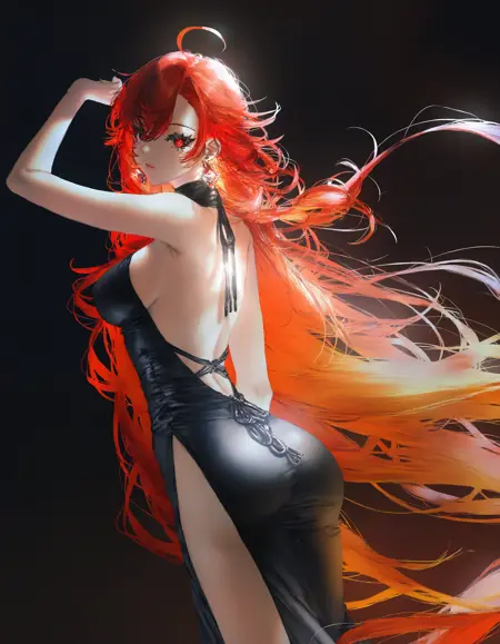 触发词:1girl, long hair, solo, jewelry, looking at viewer, earrings, red hair, multicolored hair, black gloves, red eyes, orange eyes, bodysuit, long sleeves, very long hair, closed mouth