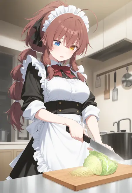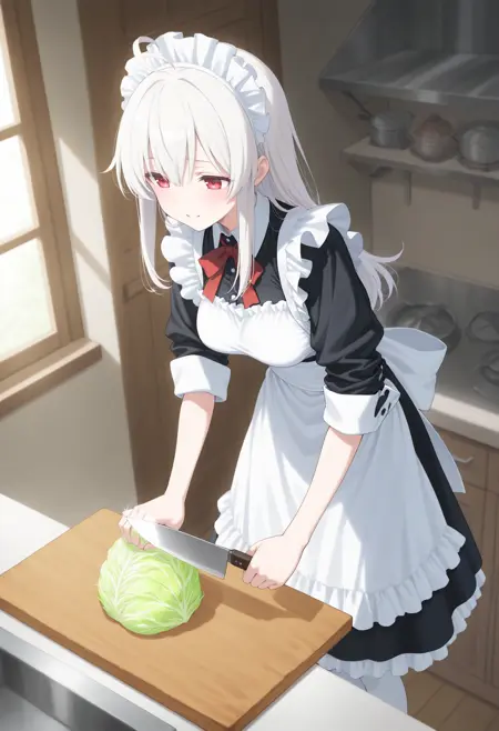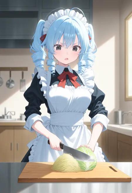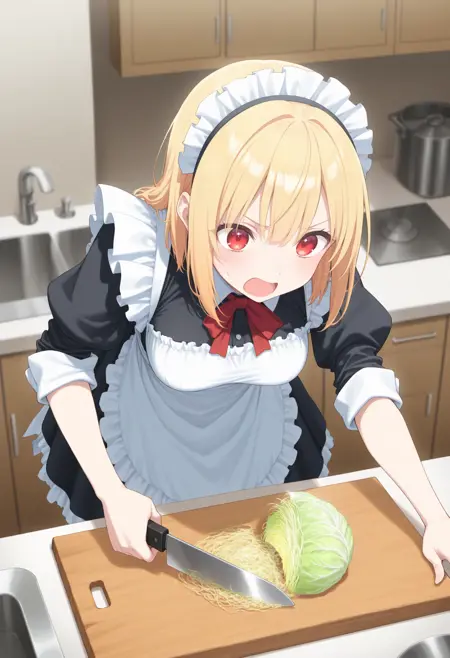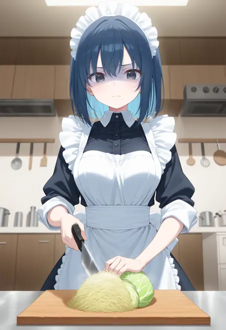 玉の状態のキャベツをまな板の上で細かく千切りにするLoRAです。