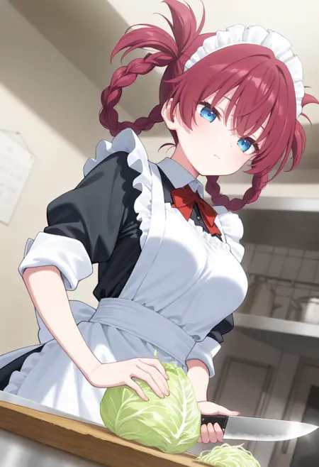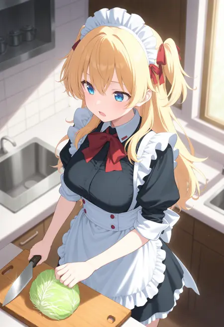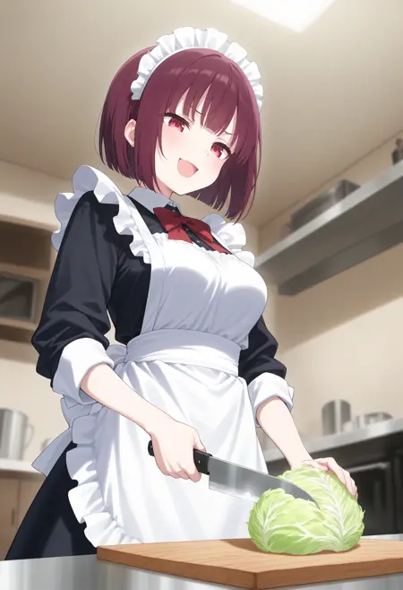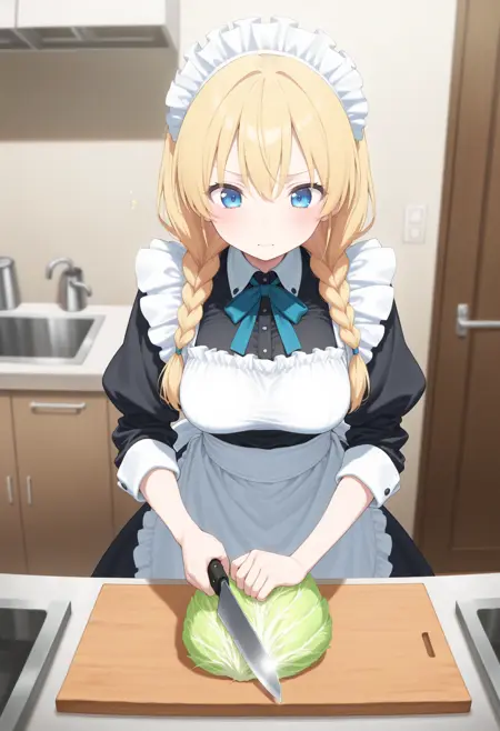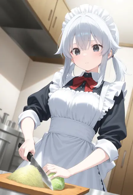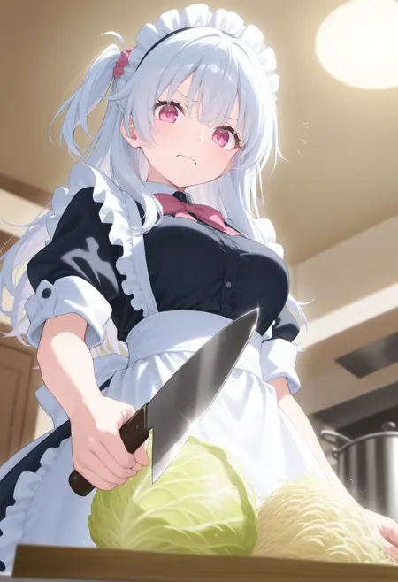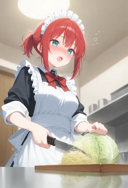 トリガーだけだと玉の状態のキャベツしか出ない事が多いので、cooking, kitchen, cutting board, holding knife, kitchen knife, cabbage, noodles を追加すると、千切りのキャベツや切り途中のキャベツが出現しやすくなります。noodles を入れる理由は、tagger が千切りを麺類と認識しているため、それを含めることで出力が可能になるからです。