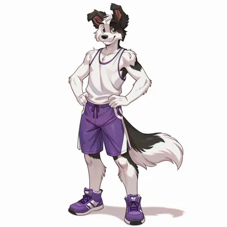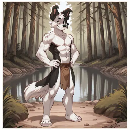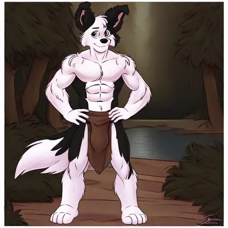 anthro, dog boy, border collie, black and white fur, brown eyes, dog ears, dog tail, fluffy tail,