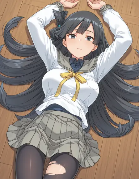 kakono hibiki, black hair, very long hair, black eyes, Hibiki_Pre, school uniform, grey sailor collar, white serafuku, blue undershirt, collared shirt, yellow ribbon, grey skirt, pleated skirt, black pantyhose