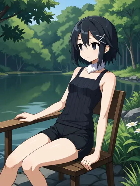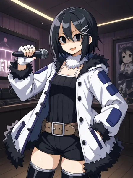 キーワード: asagidisgawars、黒髪、短髪、黒目、ヘアクリップ、目の間に髪、白い毛皮のカラー、白い指なし手袋、シャツ、白いフード付きコート、長袖、黒い毛皮のトリム、ベルト、ショートパンツ、太ももブーツ
