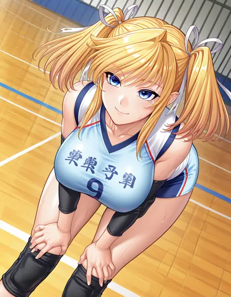 Kurenai_Volleyball, volleyball uniform, lightblue shirt, sleeveless, taut clothes, black elbow sleeves, blue shorts, short shorts, black knee pads