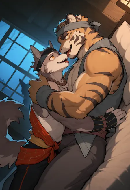 Prompt 2: betnone, tiger boy, tiger tail (グレーのヘッドバンド、オープンなベスト、巻き帯 sarashi)